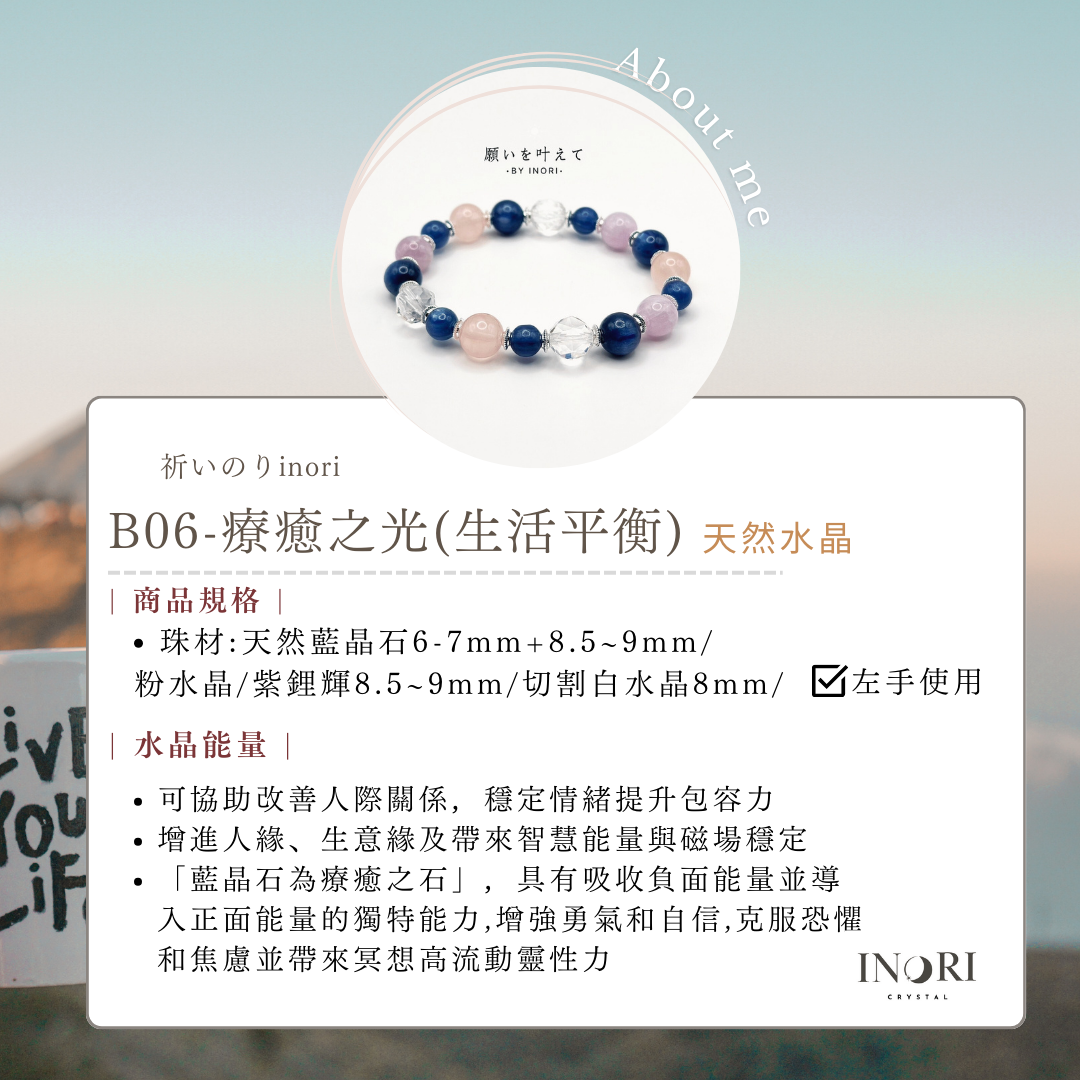 珠材:天然無染色藍晶石6-7mm+8.5~9mm/粉水晶、紫鋰輝8.5~9mm/切割白水晶8mm